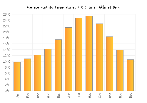 The bar chart below shows the average monthly peak daytime temperatures at ’Aïn el Berd