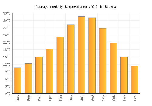 The bar chart below shows the average monthly peak daytime temperatures at Biskra
