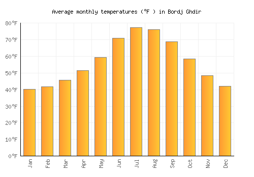 The bar chart below shows the average monthly peak daytime temperatures at Bordj Ghdir