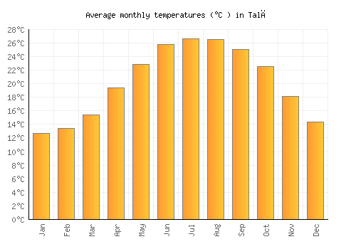 The bar chart below shows the average monthly peak daytime temperatures at Talā