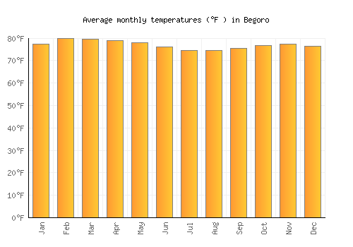 The bar chart below shows the average monthly peak daytime temperatures at Begoro