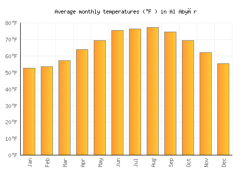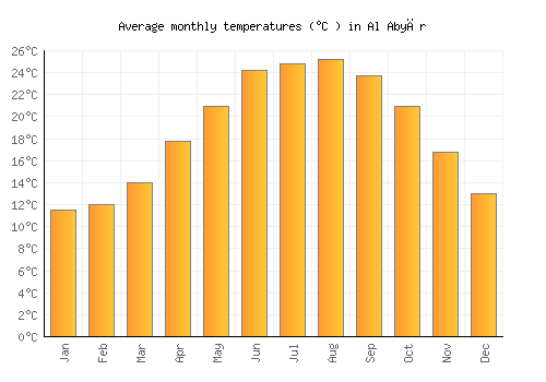 The bar chart below shows the average monthly peak daytime temperatures at Al Abyār