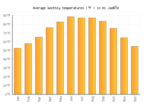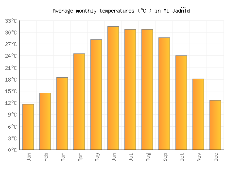 The bar chart below shows the average monthly peak daytime temperatures at Al Jadīd
