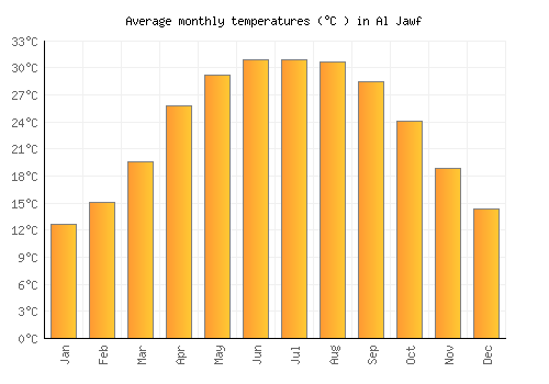 The bar chart below shows the average monthly peak daytime temperatures at Al Jawf