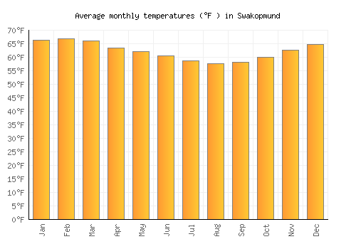 The bar chart below shows the average monthly peak daytime temperatures at Swakopmund