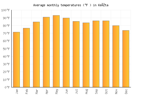 | Max °F | 71.6 | 76.8 | 84.6 | 90.9 | 93.2 | 89.8 | 85.5 | 83.8 | 86.2 | 86.2 | 79.9 | 73.6 |
