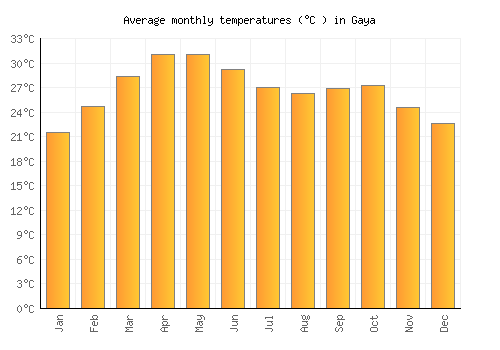 The bar chart below shows the average monthly peak daytime temperatures at Gaya