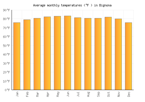 | Max °F | 75.7 | 79 | 80.6 | 82.4 | 83.1 | 83.3 | 81.3 | 80.6 | 80.8 | 82 | 80.1 | 75.9 |