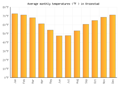 | Max °F | 72.5 | 71.1 | 68 | 61.2 | 54 | 47.5 | 47.8 | 53.1 | 60.6 | 64.9 | 68.4 | 71.1 |