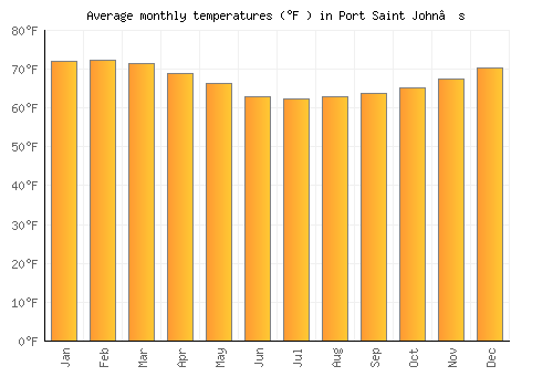 | Max °F | 72.1 | 72.3 | 71.4 | 68.9 | 66.2 | 63 | 62.2 | 62.8 | 63.9 | 65.3 | 67.6 | 70.3 |
