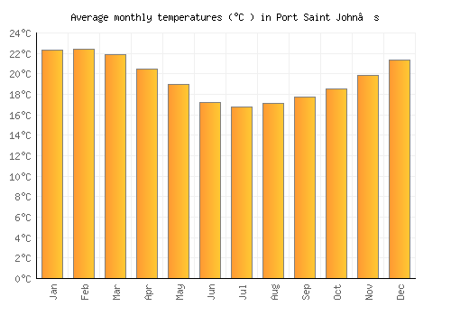 The bar chart below shows the average monthly peak daytime temperatures at Port Saint John’s