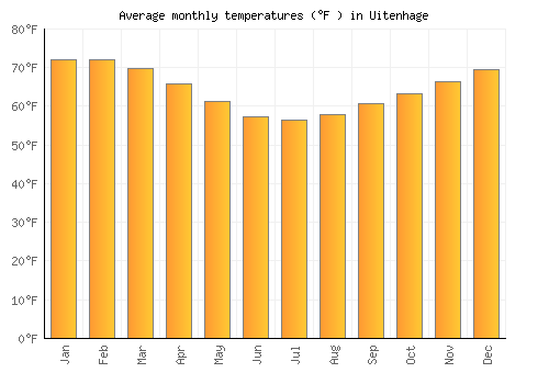 | Max °F | 72 | 72 | 69.8 | 65.7 | 61.2 | 57.2 | 56.3 | 57.9 | 60.6 | 63.1 | 66.2 | 69.4 |
