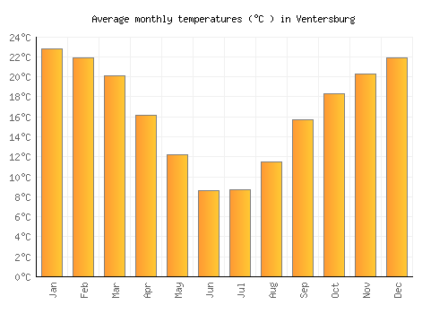 The bar chart below shows the average monthly peak daytime temperatures at Ventersburg