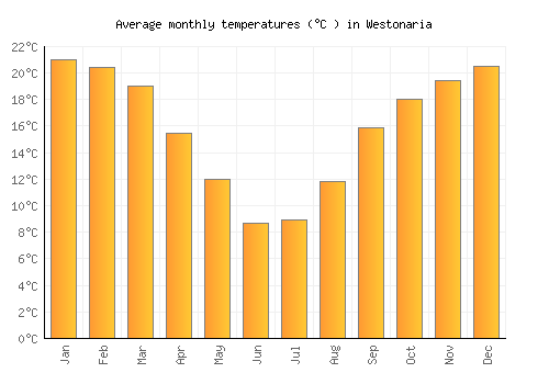 The bar chart below shows the average monthly peak daytime temperatures at Westonaria