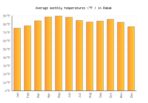 The bar chart below shows the average monthly peak daytime temperatures at Rabak