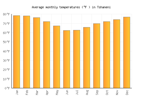 | Max °F | 78.6 | 78.3 | 76.5 | 72.1 | 67.6 | 62.6 | 62.8 | 65.8 | 69.8 | 72 | 74.3 | 77 |