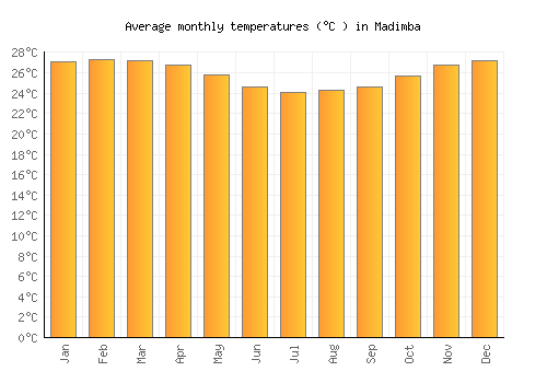 The bar chart below shows the average monthly peak daytime temperatures at Madimba