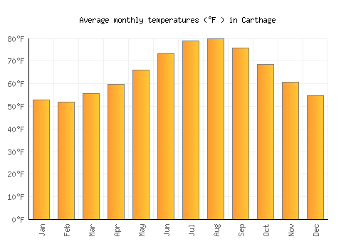 The bar chart below shows the average monthly peak daytime temperatures at Carthage