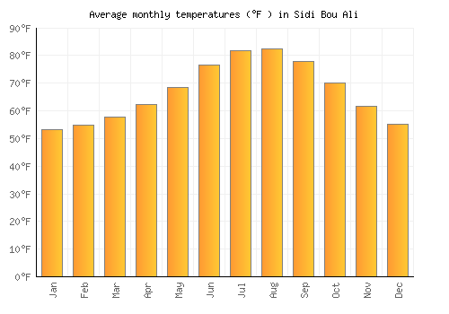The bar chart below shows the average monthly peak daytime temperatures at Sidi Bou Ali