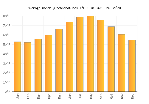 The bar chart below shows the average monthly peak daytime temperatures at Sidi Bou Saïd