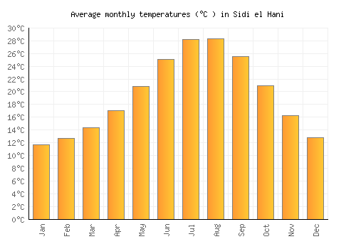 The bar chart below shows the average monthly peak daytime temperatures at Sidi el Hani