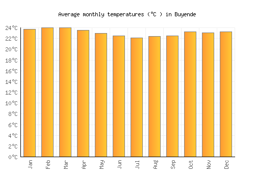 The bar chart below shows the average monthly peak daytime temperatures at Buyende