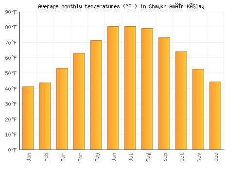 The bar chart below shows the average monthly peak daytime temperatures at Shaykh Amīr Kêlay