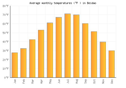 The bar chart below shows the average monthly peak daytime temperatures at Beidao