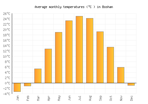 The bar chart below shows the average monthly peak daytime temperatures at Boshan