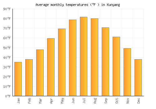 The bar chart below shows the average monthly peak daytime temperatures at Kunyang