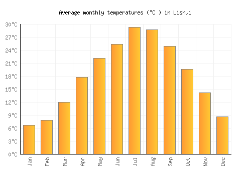 The bar chart below shows the average monthly peak daytime temperatures at Lishui