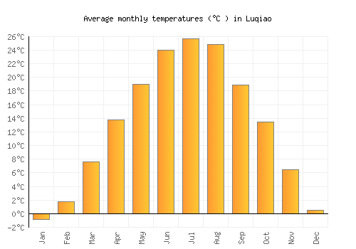 The bar chart below shows the average monthly peak daytime temperatures at Luqiao