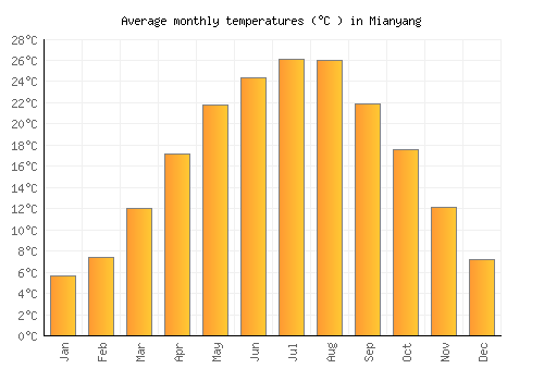 The bar chart below shows the average monthly peak daytime temperatures at Mianyang