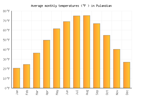 | Max °F | 20.8 | 24.6 | 36.3 | 49.8 | 61.5 | 69.1 | 74.8 | 75.2 | 66.9 | 54.9 | 40.3 | 27 |