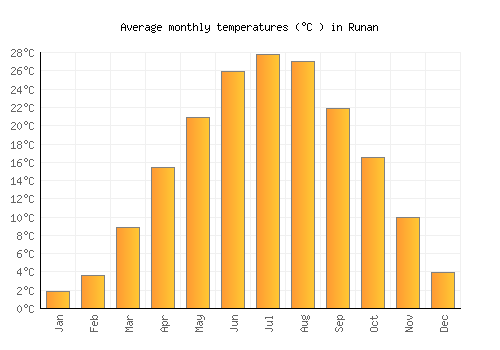 The bar chart below shows the average monthly peak daytime temperatures at Runan