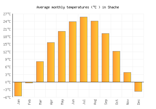 The bar chart below shows the average monthly peak daytime temperatures at Shache