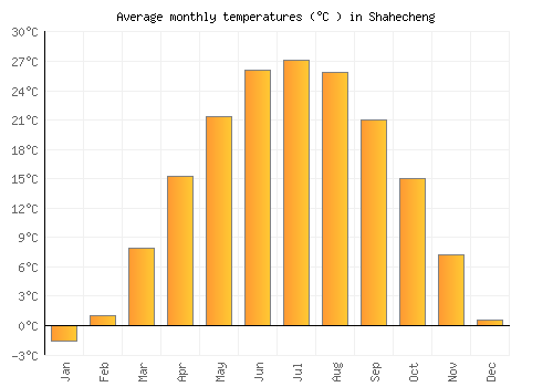 The bar chart below shows the average monthly peak daytime temperatures at Shahecheng