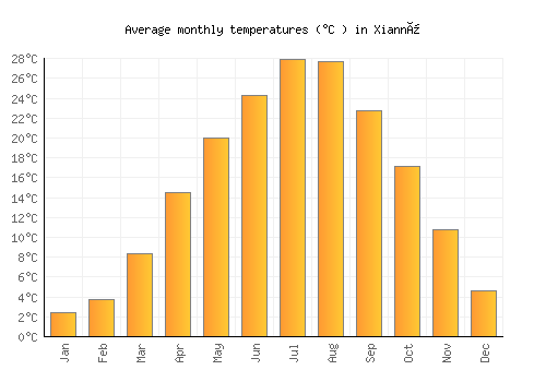 The bar chart below shows the average monthly peak daytime temperatures at Xiannü