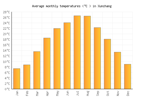The bar chart below shows the average monthly peak daytime temperatures at Xunchang