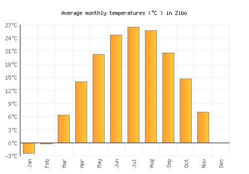 The bar chart below shows the average monthly peak daytime temperatures at Zibo