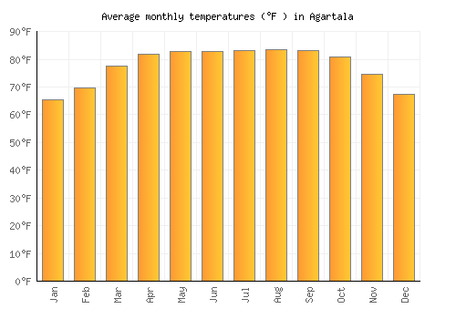 The bar chart below shows the average monthly peak daytime temperatures at Agartala