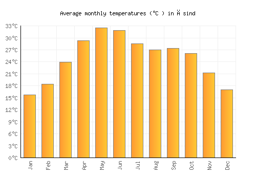 The bar chart below shows the average monthly peak daytime temperatures at Āsind