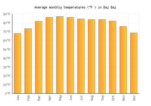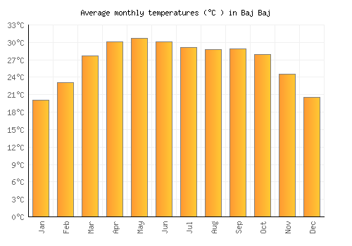 The bar chart below shows the average monthly peak daytime temperatures at Baj Baj