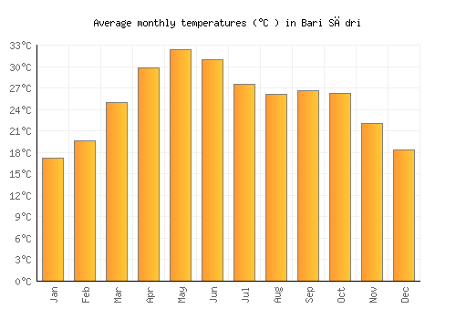 The bar chart below shows the average monthly peak daytime temperatures at Bari Sādri