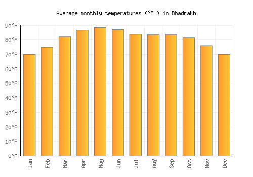 The bar chart below shows the average monthly peak daytime temperatures at Bhadrakh