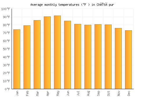 The bar chart below shows the average monthly peak daytime temperatures at Chītāpur