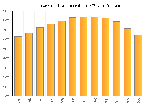 The bar chart below shows the average monthly peak daytime temperatures at Dergaon