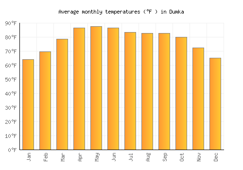 The bar chart below shows the average monthly peak daytime temperatures at Dumka