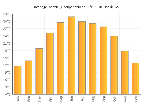 The bar chart below shows the average monthly peak daytime temperatures at Hariāna