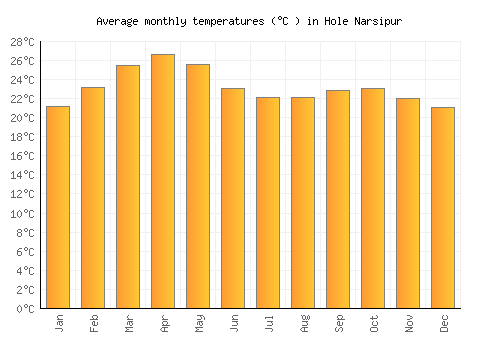 The bar chart below shows the average monthly peak daytime temperatures at Hole Narsipur